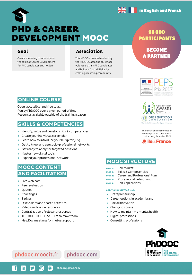 📘 Watch the tutorial 📄 Participation guide ✏️ Register for the MOOCPhDOOC is an association, constituted under the French law of 1901, whose aim is to train and support PhD students and graduates, and enable the creation of a community. To do this, we have launched the first MOOC in France on career development for PhD candidates and graduates in all fields. Our aim is to create a space dedicated to information sharing, discussion and mutual assistance on this topic.